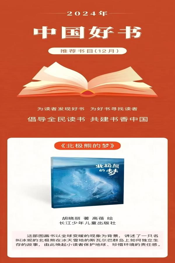 2025年1月9日,中國(guó)圖書(shū)評(píng)論學(xué)會(huì)2024年12月“中國(guó)好書(shū)”推薦書(shū)目發(fā)布,長(zhǎng)江少年兒童出版社出版的《北極熊的夢(mèng)》入選。