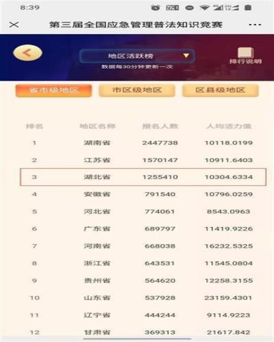 (通訊員 史磊蕾 鄭小柳)11月25日,第三屆全國應(yīng)急普法知識競賽線上答題活動結(jié)束,我省共有1255410人參與了答題,活躍榜排名全國第三,成績榜排名全國第四。按照競賽規(guī)則,湖北成功入圍全國總決賽。第三屆全國應(yīng)急普法知識競賽湖北賽區(qū)活動由湖北長江傳媒安全生產(chǎn)文化傳播有限公司承辦。目前,省應(yīng)急管理廳已通過考試和座談等方式選拔出了18名優(yōu)秀人才。他們正在組織集中培訓(xùn),最終有6人將代表湖北省參加全國總決賽。